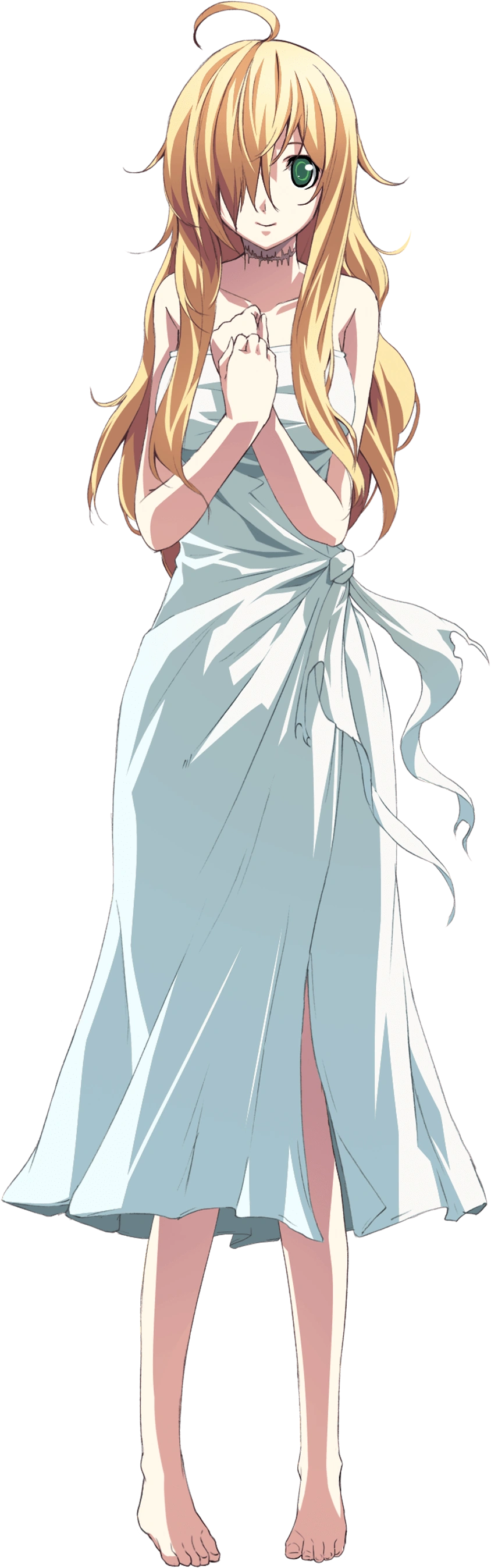 Marie is a young girl with waist length blonde hair, her back hair slightly spiky and her bangs covering her left eye, which is green. She is noted to be extremely beautiful.